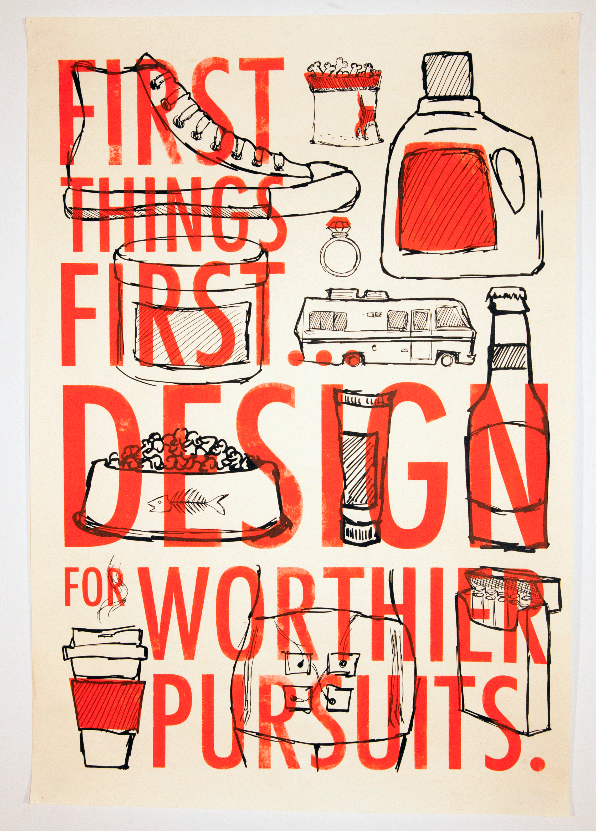 Poster based on the "First Things First Manifesto" from 1964 and 2000. I hand drew each illustration, based on the various products and objects mentioned in both manifestos. The orange text was then silkscreened on the top layer.